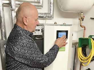 Jürgen Kohle vor der neuen Übergabestation, die den hauseigenen Heizkreislauf mit dem Nahwärmenetz verbindet.