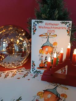 Seit Mitte November ist eine kostenfreie Weihnachtsbroschüre, herausgegeben von der Köthen Kultur und Marketing GmbH, erhältlich. Sie entstand in Zusammenarbeit mit den Partnern, die die drei Weihnachtsmärkte an den Advent-Wochenenden in Köthen gestalten. Titel- und Rückseite des achtseitigen Heftes, das u.a. in Touristinformation, Veranstaltungszentrum und in diversen Geschäften ausliegt, wurden traditionell vom Köthener Steffen Fischer mit dessen Halli-Motiven gestaltet. Informationen gibt es in der Broschüre zum Programm des Weihnachtsmarktes vom CFC Germania 03 am ersten Advent-Wochenende im Stadion Köthen, eine Woche später schließt sich der Weihnachtsmarkt von Werbegemeinschaft und Kirche St. Jakob auf dem Marktplatz an und schließlich komplettiert die Schlossweihnacht rund um den dritten Advent die vorweihnachtlichen Aktionen. Weihnachtsmarkt-Fans finden zudem eine Übersicht mit einer Auswahl weiterer Märkte und von Veranstaltungen im Advent in der Region im Heft.