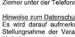 Es wird darauf aufmerksam gemacht, dass Dritte (Privatpersonen) mit der Abgabe einer Stellungnahme der Verarbeitung ihrer angegeben Daten, wie Name, Adressdaten und E-Mailadressen zustimmen. Sofern Sie Ihre Stellungnahme ohne Absenderangaben abgeben, erhalten Sie keine Mitteilung über das Ergebnis der Prüfung nach Abschluss des Verfahrens. Gemäß Art. 6 Abs. 1e EU-DSGVO werden die Daten im Rahmen des Bauleitplanverfahrens für die gesetzlich bestimmten Dokumentationspflichten und für die Informationspflicht Ihnen gegenüber genutzt.