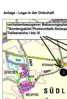 Das Plangebiet befindet sich östlich der Ortslage Reupzig. Der Teilbereich I befindet sich südlich der Dorfstraße bzw. Ortslage Storkau als Ortsteil von Reupzig. Die Teilbereiche II und III liegen östlich der Ortslage Friedrichsdorf. Die Lage in der Ortschaft und der Geltungsbereich des Vorhabenbezogenen Bebauungsplanes sind nachfolgend zu dieser Bekanntmachung dargestellt.