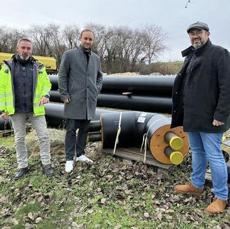 Baustellenbesichtigung in Quellendorf: Sven Kalepky, Bauleiter Rohr- & Tiefbau, Felix Schwahn, Geschäftsführer bei der GP JOULE Wärme mit Bürgermeister Thomas Schneider im Gespräch über die Fortschritte des Wärmenetzes (v.l.n.r.).
