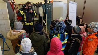 Er hatte ein lustiges Quiz für die Kinder vorbereitet, erklärte ihnen die ganzen Gerätschaften, zog eine komplette Feuerwehrausrüstung an und zeigte ein Feuerwehrauto in Aktion.