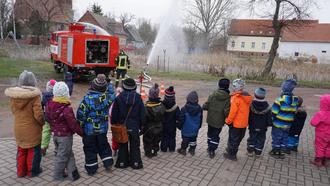 Die Kinder durften selbst in die Einsatzkleidung steigen, vieles anfassen und ausprobieren, im Auto Platz nehmen und zum Schluss noch selbst mit der Spritze einen „Hausbrand“ löschen.