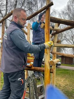 Der große Sandkasten wurde mit neuem Sand befüllt, es wurde gestrichen, die bunten Laternen wurden im Sitzbereich der Kinder aufgehangen, die Beete schick gemacht, gekehrt und aufgeräumt.
