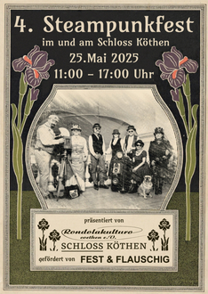 Auf eine Zeitreise geht es am 25. Mai von 11 bis 17 Uhr beim 4. Steampunk-Fest im Schloss Köthen, veranstaltet vom „Rondo la kulturo coethen“ e.V. und unterstützt von der Köthen Kultur und Marketing GmbH. Steampunks und Freunde dieser kulturellen Bewegung erwartet erneut ein feines Programm im einmaligen Ambiente der altehrwürdigen Schloss- und Parkanlage. Dabei sind unter anderem die Bands „Nobody Knows“ aus Stendal, „Trio Klangart plus Bass“ aus Erfurt und die „Fabulöse Wanderbühne“ aus Dresden. Freuen dürfen sich die Besucher zudem auf „Die Maschine - vom Antrieb zum Klangtrieb“ aus Flensburg, Philipp Burchardt mit der Great Highland Bagpipe und „Schmiede-Jahnert“ aus Eisleben. Steampunk-Maker, Künstler und Tüftler mit ihren fantasievollen Dioramen, Schmuckstücken, Maschinen und Wundern der Technik komplettieren das Steampunk-Fest. Neben Musik und Tänzen gibt es darstellendes Handwerk, Programmpunkte für die kleinen Gäste, ein offizielles Amt - das „Institut für unbestimmte Studien“ -, die Kryptozoologin Mary Blackness sowie Speisen und Getränke, die zum allgemeinen Wohlbefinden der verehrten Zeitreisenden beitragen mögen. Das Wichtigste an diesem Tag sind jedoch die Besucherinnen und Besucher in ihren fantastischen Gewandungen, die herzlich eingeladen sind, das Schlossgelände erneut in eine längst vergangene und gleichzeitig futuristische Epoche versetzen.