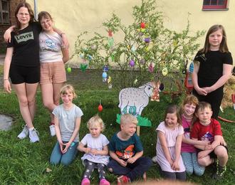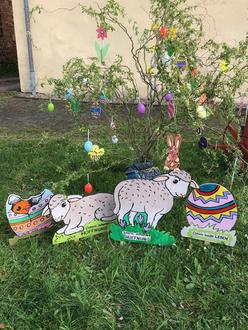 Der Osterstrauß hatte wieder seinen Platz auf der Grünfläche vor dem Feuerwehrgerätehaus. Die Kinder konnten sich die Figuren und bunten Plastikeier zum Anhängen an den Strauß aussuchen und so füllten sich nach und nach die Zweige. Vier größere, mit Sprüchen verzierte Figuren vervollständigten das bunte „Osterbild“. Diese Figuren wurden ebenfalls von den Kindern farblich gestaltet Nach dem Schmücken gab es verdientermaßen noch eine kleine Stärkung für die Kinder.