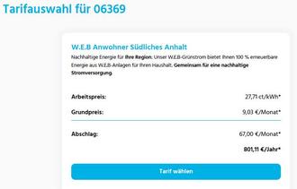 Neukunden können den Tarif nunmehr jederzeit schnell und unkompliziert online über die WEB-Webseite (https://www.web.energy/de-de/gruenstrom) abschließen. Einfach beim Herunterscrollen unter „Grünstrom Privat“ auf „jetzt abschließen“ klicken. Nach Eingabe von Postleitzahl und Ort wird der „W.E.B. Anwohnertarif Südliches Anhalt“ angeboten.