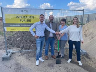Spatenstich für die Heizzentrale Quellendorf: Projektleiter Matthias Volk, Bürgermeister Thomas Schneider, Ortsbürgermeisterin Doris Zimmermann und Ramona Paul, Geschäftsführerin der GP JOULE THINK GmbH (v.l.n.r.) läuten gemeinsam die nächste Bauphase ein.