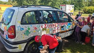Eine besondere Attraktion bot auch der Autowrackplatz Repau, der großzügig ein Auto zur Verfügung stellte. Dieses diente als riesige Leinwand, die die Kinder nach Herzenslust bemalen durften. Mit bunten Farben und viel Kreativität verwandelten sie das Fahrzeug in ein kunterbuntes Kunstwerk.