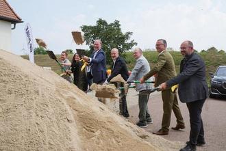 Symbolischer Spatenstich für den Bau des Wärmenetzes in Quellendorf: (von links) Matthias Volk (Projektleiter GP JOULE), Andrea Behr (Leiterin Business Development Ostdeutschland), Heinrich Gärtner (Mitgründer und CTO GP JOULE), Marco Pannicke (Geschäftsführer Grüne Energien Bitterfeld), Ministerpräsident Reiner Haseloff, Andreas Rößler in Vertretung von Landrat Andy Grabner und Bürgermeister Thomas Schneider.