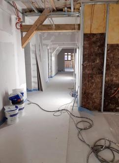 Im Rahmen der Rathaussanierung wird derzeit das Dachgeschoss ausgebaut und die Fassade bearbeitet. Im zuvor leeren Dachgeschoss entstehen sechs neue Büros und ein Lagerraum. Auch die große Lüftungsanlage für den Sitzungssaal befindet sich in dieser Etage. Die Trockenbau- und Elektroarbeiten sind zu 80 Prozent abgeschlossen, sodass mit Beginn des neuen Jahres bald der Boden verlegt werden kann und die Maler tätig werden können. Der Flur wird wie im zweiten Obergeschoss mit Dielen ausgestattet. Die Büros erhalten einen Linoleumboden. Grund für den zeitlichen Verzug beim Ausbau ist Personalmangel. Die Baufirmen haben zu wenig Mitarbeiter und sind durch einen hohen Krankenstand zusätzlich belastet. So war im Rathaus beispielsweise drei Wochen lang kein Trockenbauer vor Ort. Die Baustelle kam dadurch fast vollständig zum Erliegen. Für weitere Verzögerungen hat die Umsetzung der Brandschutzauflagen in dem historischen Gebäude gesorgt.