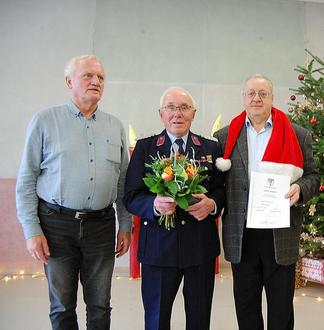Stadtratsvorsitzender Jörg Freiwald (r.) und sein zweiter Stellvertreter Johannes Drewitz (l.) überreichten die Ehrennadel der Stadt Weißenfels an Gunter Petzold. (Bildquelle: PAS Großkorbetha)
