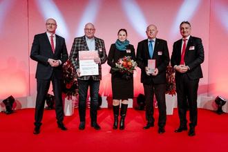 Der Weißenfelser Ruderverein erhielt den Unternehmerpreis des ostdeutschen Parkassenverbandes, Kategegorie Vereine des Landes Sachsen-Anhalt. Zur Verleihung fuhren die Mitglieder des Vorstands Frank-Otto Democh (2.v.l.), Annegret Günther (Mitte) und Ekkart Günther (2.v.r.) am 28. November 2024 nach Potsdam. Der Preis wurde von Ludger Weskamp (Geschäftsführender Präsident des Ostdeutschen Sparkassenverbandes, links) und Mario Kerner (Vorstand der Sparkasse Burgenlandkreis, rechts) überreicht. (Bildquelle: Ostdeutscher Sparkassenverband)