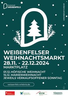 | Bild 3 | Marktplatz, 06667 Weißenfels Bbis 22.12.2024 Weißenfelser Weihnachtsmarkt Die Tage werden kürzer und kälter, der Advent steht vor der Tür. Vier Wochen herrscht vorweihnachtliches Treiben in der Saalestadt. Ein prächtig geschmückter Weihnachtsbaum steht mitten auf dem Marktplatz. Um ihn herum gesellen sich Verkaufsstände, ein Handwerkerdorf, Märchenhütten, Kinderkarusselle und eine große Pyramide mit liebevoll gestalteten Figuren. Nicht nur Kinderaugen werden leuchten. Öffnungszeiten: So.-Do. 11:00 Uhr bis 19:00 Uhr Fr.-Sa. 11:00 Uhr bis 20:00 Uhr |
