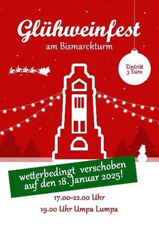| Bild 18 | Bismarckturm, Erich-Lattermann Straße 1, 06667 Weißenfels 18.01.2025, 17:00 Uhr 18. Glühweinfest am Bismarckturm Aufgrund der Wetterbedingungen wurde das Glühweinfest auf den 18. Januar 2025 verschoben. Der neue Termin bildet nun den Auftakt unseres Jubiläumsjahres. Die Gäste können sich also nicht nur auf ein wie immer stimmungsvolles Glühweinfest freuen, sondern auch eine schöne Einstimmung zum Start ins Jubiläumsjahr. Ab 19.00 Uhr wird es musikalisch. Für das leibliche Wohl sorgen Leckereien vom Grill, zusammen mit süßem und salzigem Backwerk.Eintritt: 3,00 € |