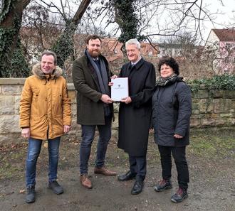 Der Präsidenten des Landesverwaltungsamtes Sachsen-Anhalt Thomas Pleye (2.v.r.) überreichte einen Fördermittelbescheid aus dem Programm „Lebendige Zentren“ für die Weißenfelser Schlossanlage an den Weißenfelser Oberbürgermeister Martin Papke (2. v.l.) sowie an Heike Weiß von der Abteilung Stadtplanung und Peter Zimmermann von der Abteilung Hochbau. (Bildquelle: Katharina Vokoun)