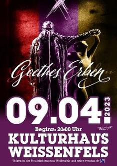 | Bild 17 | Kulturhaus, Merseburger Straße 14, 06667 Weißenfels 09.04.2023, 20:00 Uhr Goethes Erben - X Tour 2023 Nach den Osterfeiertagen 2023 und direkt nach der Veröffentlichung des zehnten und letzten Studioalbums "X" von Goethes Erben wird sich ein Bandmitglied aus der aktuellen Liveband vorerst von der Bühne verabschieden. Diese Verabschiedung ist nicht das Ende von Goethes Erben, sondern markiert den Abschluss einer Schaffensperiode. Nach dem sehr düsteren und ernsten "X"-Teil werden Goethes Erben sich mit einem Streifzug durch die Bandgeschichte verabschieden und sicherlich bei ihren Gästen manch schöne Erinnerung wachrufen und neue Erinnerungen schaffen. |