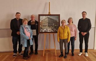 Aus dem Nachlass Wilfried Schreiers stammt das Ölgemälde „Institut für die lederverarbeitende Industrie“. Seine Erben übergaben es am 27. Februar 2026 an das Museum Weißenfels. Zugegen waren Kulturamtsleiter Christian Endt, Tochter Monika Ulbricht, Sohn Matthias Schreier, Tochter Bettina Löser, Tochter Regina Köberle und Museumsleiter Manuel Schwarz (v.l.n.r.).