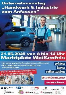 | Bild 29 | Marktplatz Weißenfels, 21.05.2025, 08:00-14:00 Uhr Unternehmenstag „Handwerk & Industrie zum Anfassen“ Beim Unternehmenstag „Handwerk & Industrie zum Anfassen“ treffen junge Menschen auf potenzielle Arbeitgeber, Familien entdecken die wirtschaftliche Vielfalt der Region – und Mitmachaktionen bringen spannende Berufe hautnah erlebbar auf den Platz. |