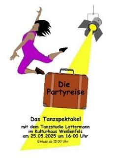 | Bild 31 | Kulturhaus Weißenfels, Merseburger Straße 14, 06667 Weißenfels 25.05.2025, 16:00 Uhr Das Tanzspektakel mit dem Tanzstudio Lattermann - Motto: "Partyreise" Eine Gruppe Teenager plant eine Tour so ganz nach ihren Vorstellungen. Bunte Events und tolle Erlebnisse machen ihren Ausflug zu einer einzigartigen " Partyreise ". |
