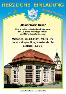 | Bild 16 | Novalispavillon, Klosterstr. 24, 06667 Weißenfels 30.04.2025 – 19:00 Uhr „Rainer Maria Rilke“ Literarisch-musikalisches Programm mit Dr. Hans-Henning Schmidt und Maria Isabella Vescovi Eintritt: 4,00 € |