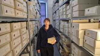 BU: Stipendiatin Jolanda Zürcher im Depot des Weißenfelser Schuhmuseums (Bildquelle: Museum Weißenfels)