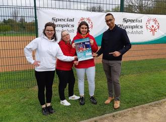 Die Geschäftsführerin von Special Olympics Sachsen-Anhalt Susann Albrecht (l.) und der Betriebsleiter des Sport- und Freizeitbetriebs Serge Musengeshi stellten mit Lea Schergun (l.) und Anna Dilan Dag zwei Gesichter der Special Olympics Landesspiele 2023 vor.