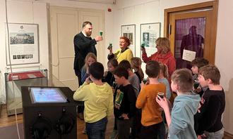 Oberbürgermeister Martin Papke, Museumspädagogin Ilonka Struve (hinten, 2.v.l.) und die 3. Klasse der Bergschule bei der Präsentation der neuen Videos auf der Medienstation im Museum Weißenfels. (Bildquelle: Mike Sachse)