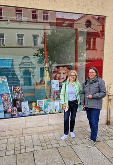 Unternehmerin Katrin Jährling-Fricke und Wirtschaftsförderin Denise Demnitz vor dem Schaufenster Jüdenstraße 16 (v. l. n. r.) (Bildquelle Stadt Weißenfels)