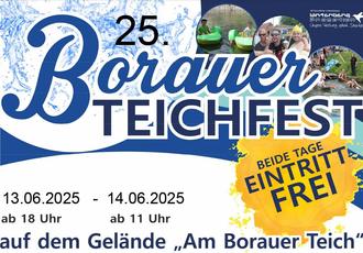 Wir möchten Sie herzlichst zu unserem jährlichen Dorffest in Borau am Freitag und Sonnabend, 13. und 14. Juni 2025 einladen. Das Fest findet auf dem Gelände rund um den „Borauer Teich“ statt. Beginn ist am Freitag um 18 Uhr mit der Eröffnung des Festes durch den Ortsbürgermeister. Die Schalmeienkapelle Taucha wird den Fackelumzug ab 19 Uhr begleiten. Am Abend ab 20 Uhr wird im Festzelt die Disko R&M Music für Stimmung sorgen.