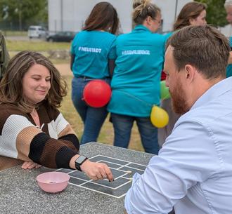 Die Weißenfelser Bürgerin Jennifer Weinkauf forderte beim Nachbarschaftsfest Oberbürgermeister Martin Papke zum Mühle-Duell heraus. (Bildquelle: Katharina Vokoun/Stadt Weißenfels)