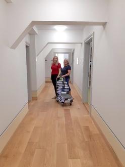 Saskia Trecsko (l.) und Yvette Scharf von der städtischen Abteilung Hochbau bringen Berge von Akten in das neue Büro im Dachgeschoss des Weißenfelser Rathauses. (Bildquelle: Katharina Vokoun/Stadt Weißenfels)