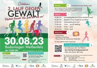 Der „Lauf gegen Gewalt“ startet um 16:30 Uhr mit einem Bambini-Cross-Hindernis-Lauf für Kinder. Alle teilnehmenden Kids erhalten wieder eine Medaille und eine kleine Geschenktüte; gesponsert vom Asklepios Bildungszentrum und vom DM-Drogeriemarkt Weißenfels. Es folgen Läufe auf zwei, fünf und zehn Kilometer langen Strecken (17 Uhr, 17:45 Uhr, 18:30 Uhr). Die Zwei-Kilometer-Strecke kann auch gehend in gemütlichem Tempo bewältigt werden. Auf diese Weise ist für Menschen aller Fitness-Level eine Teilnahme am „Lauf gegen Gewalt“ möglich. Die Ausgabe der Startnummern mit integriertem Zeitmesser erfolgt an den Badanlagen. Für Gruppen wird es hinsichtlich der Startnummernausgabe eine gesonderte Lösung im Vorfeld der Veranstaltung geben.
