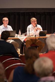Unter anderem informierte der Präsident der Landesstraßenbaubehörde Sachsen-Anhalt Dr. Stefan Hörold (r.) die Bürgerinnen und Bürger im Kulturhaus über die Pläne zum Neubau der Großen Saalebrücke. (Bildquelle: Landesstraßenbaubehörde)