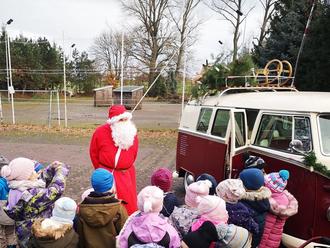 Der Tag begann für die Kinder im Kindergarten mit dem traditionellen gemeinsamen Weihnachtsfrühstück. Nach dem Frühstück begaben sich die Kinder gemeinsam mit ihren Erzieherinnen auf die Suche nach dem Weihnachtsmann. Vorbei an dem Denkmal, dem Autohaus und dem Teich konnten die Kinder am Sportplatz einen weihnachtlich geschmückten VW Bulli erkennen. Die Kinderaugen begannen zu leuchten und die Aufregung war groß.