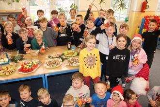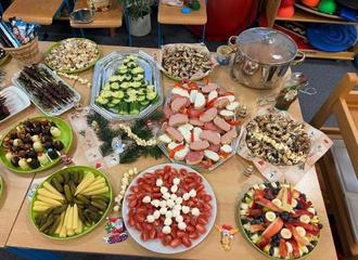 Daneben fanden sich „Dickmannelche“- kleine Tiere, die traditionell zur Weihnachtszeit der Kinder gehören. Für eine herzhafte Note sorgten die Tomaten- Mozzarella-Flocken, die in Form von Schneeflocken angerichtet waren. Fleischbällchen Spieße und dekorativ belegte Brötchen ergänzten das Angebot und stillten den kleinen Hunger. Doch auch süße Versuchungen fehlten nicht: Schokoladenweintraubenspieße, Kekse und ein weihnachtlich angerichteter Obstteller (Ein großes Dankeschön an den Förderverein von Kindergarten und Hort, der dieses Obst dem Buffet zusteuerte.) boten Abwechslung für jeden Geschmack. Selbst Würstchen durften nicht fehlen, was besonders die jüngeren Schüler begeisterte.