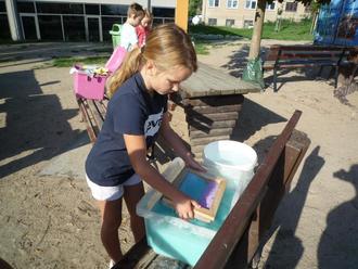 Aktivität und Kreativität waren beim Papierschöpfen, wo unter Anleitung von Frau Erdmann und ihrer Mitarbeiterin von der Grünen Welle Naundorf wunderschöne Unikate entstanden, gefragt. Auch bei der Umgestaltung des Schlossparks zu einer Poollandschaft brachten unsere Hortkinder ihre Ideen mit ein. So entstanden unter fachkundiger Anleitung farbenfrohe Liegestühle, Sonnenschirme und dekorative Accessoires.