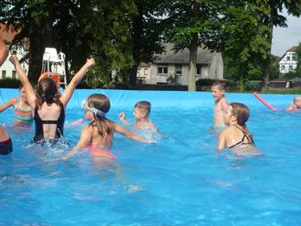 Sportlich unterwegs waren wir noch einmal in unserer letzten Ferienwoche, denn endlich war der Pool im Schlosspark gefüllt und sogar das Wetter spielte mit. Unter Anleitung von Frau Schlechter wurden Schwimmkurse absolviert und Wasserspiele durchgeführt. Der Spaßfaktor kam dabei nicht zu kurz.