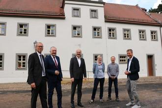 v. l. n. r. Bürgermeister Matthias Müller, Sachsens Staatsminister für Regionalentwicklung Thomas Schmidt, Sächsischer Landeskonservator Alf Furkert, Hauptamtsleiterin Katja Hannß, Bauamtsleiter Thomas Keller und Landrat Kai Emanuel vor dem neusanierten Westflügel des Alten Jagdschlosses in Wermsdorf. ⇔ Foto: Jana Brechlin