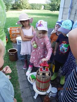 Genau wie im bekannten Kinderlied von Wolfgang Hering folgten wir Ende September Frau Scheller’s Einladung zur diesjährigen Apfelernteaktion im Kirchgarten, stellten die Leiter unter die Apfelbäume, kletterten hinauf und füllten unsere Körbchen voll mit saftigen Äpfeln, bis kein reifes Früchtchen mehr zu sehen war. Nach getaner Arbeit durfte eine kleine Kostprobe der frisch gepflückten Äpfel natürlich nicht fehlen. Doch das war noch nicht alles. Frau Scheller hatte sich in diesem Jahr eine ganz besondere Aktion einfallen lassen – die Herstellung von eigenem Apfelsaft! Mit einer Saftpresse quetschten wir die Früchte aus, bis wir leckeren Apfelsaft erhielten.