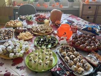 Am Mittwoch, den 25.10.2023 freuten sich die Calbitzer Grundschüler ganz besonders auf den Schulschluss. Denn danach verkleideten sie sich als Hexen, Geister und Vampire. Die Gruselparty startete mit einem gespenstisch leckerem Buffet. Vom Mumienwürstchen, Geisterbananen, Monsterspießen, Bowle, Kürbismandarinen, Gemüsegeistern und Gruselmuffins bis zu Nascherein und Chips konnten sich die Partygäste die Bäuche vollschlagen.