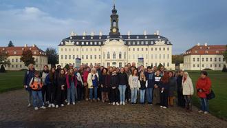 Denn die Französischschüler der Klassen 7a und 7b der Oberschule Wermsdorf bereiteten einen Rundgang in der Hubertusburg auf Französisch vor. Am 25.10.2023 empfingen die Schüler ihr französisches Publikum vor den Toren der Hubertusburg. Bei einem Rundgang über das Gelände wurden auf Französisch in kurzen Sätzen die Geschichte und die Architektur der Hubertusburg vorgestellt.