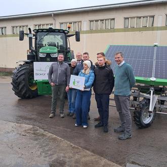 Landrat Kai Emanuel, Jung-Landwirt Tom Dworak, William Paulsen, Jana Paulsen, Dirk Paulsen, der Wermsdorfer Bürgermeister Matthias Müller, Elke Neubert, Vorsitzende des Regionalbauernverbands Torgau, und Landwirtschaftsmeister Norman Hofmann auf dem Gelände des Biohofs Paulsen.