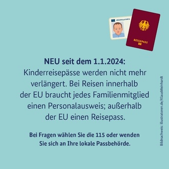 Der Kinderreisepass hat ausgedient. Der Bundestag hat die Abschaffung des Dokumentes beschlossen. Für Reisen außerhalb der EU gibt es stattdessen seit dem 1. Januar 2024 nur noch den Reisepass, für Reisen innerhalb der EU ist der Personalausweis ausreichend. Bereits ausgestellte Kinderreisepässe behalten ihre Gültigkeit bis zu ihrer regulären Ablauffrist. Ob ein Reisepass oder ein Personalausweis benötigt wird, ist abhängig vom Zielland. Wer mit Kindern verreisen will, sollte daher auf jeden Fall rechtzeitig die Einreisebestimmungen des Ziellandes überprüfen. Welche Dokumente für Ihr Reiseland nötig sind, erfahren Sie unter: www.auswaertiges-amt.de