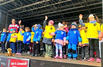 Von den Zuschauern kam ein lautes „Zugabe“ und alle schauten sich verwundert an. Moderator Stefan Bräuer handelte blitzschnell und verwandelte den Festplatz in einen Hexenkessel. Groß und Klein beendeten den aufregenden Tag mit dem Fliegerlied. Zur Belohnung gab es noch Gummibärchen von der IKK. So konnten alle Kinder voller Stolz den aufregenden Tag beenden.