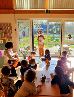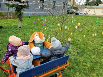 Beim Osterfest in der Kita bekamen alle Kinder der Einrichtung ein Osterfrühstück. Dabei konnte Jeder sein gefärbtes Ei genießen und einen aufregenden Tag beginnen. Es dauerte gar nicht lange, als die ersten Kinder den Osterhasen entdeckten. Dieser schlich um die Einrichtung und verteilte bunte Eier und Osterkörbchen im gesamten Garten. Fast jede Gruppe sang dem Osterhasen ein Lied und bedankten sich herzlichst bei diesem. Nun aber husch, in den Garten, bevor die Osternester wieder weg sind. Ein jedes Kind wurde fündig und die Kids präsentierten sich gegenseitig die gefundenen Nester. Viele der Kinder wussten nicht, dass sie den Osterhasen an diesem Tag nochmals sehen würden. Umso größer war die Überraschung.