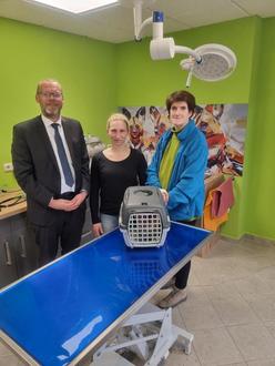 Bürgermeister Matthias Müller begrüßt die beiden neuen Tierärztinnen Katja Loßner (Bildmitte) und Dr. Beate Landmann (rechts im Bild) in ihren Praxisräumen in der Friedhofstraße 4 in Wermsdorf.