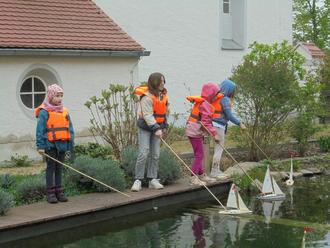 Danach nahm uns der „Kapitän“ mit hinaus an seinen Teich. Jedes Kind bekam nun eine Schwimmweste angelegt und durfte ein Spielschiff über das Wasser segeln lassen. Dazu erklärte der „Kapitän“ wichtige Begriffe aus der Seefahrt und erläuterte den Umgang mit einem Kompass.