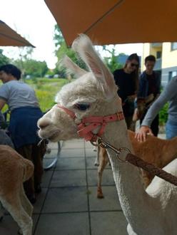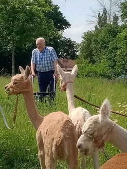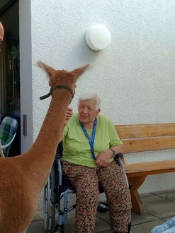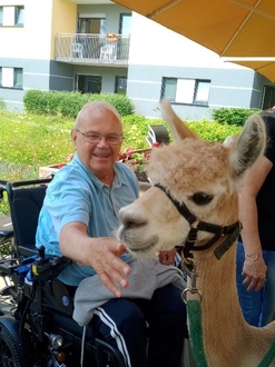 Am Samstag, den 01. Juni 2024, freuten sich unsere Seniorinnen und Senioren, dass uns die Vierbeiner vom „Zauberland Alpakas“ der Familie Kraft von Wedel wieder besuchten. Die Alpakas wurden u.a. von Therapeuten, Ärzten und Psychologen begleitet, die an dem Kurs „Ausbildung von Alpakas für Therapiezwecke“ teilnahmen. Nach dem sich die frisch geschorenen Tiere von Wiederoda auf den Weg zu uns gemacht hatten, legten sie als erstes eine kurze Verschnaufpause ein. Unsere wunderschöne Wildblumenwiese mit ihrer Blütenvielfalt lockt nicht nur täglich nützliche Insekten an, auch die Alpakas erfreuten sich an dem reichlich vielfältigen Nahrungsangebot. Gut gestärkt und von der Autofahrt erholt, statteten dann die sanftmütigen Vierbeiner unseren Bewohnerinnen und Bewohnern im Garten und auch in der Cafeteria des Hauses einen Besuch ab. Während einem Kennenlernen durch Gespräche mit den Kursteilnehmern und der Familie Kraft von Wedel durften Streicheleinheiten der Alpakas natürlich nicht fehlen.