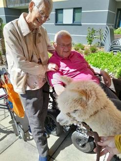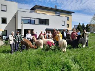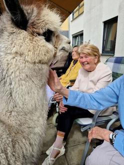 Am Samstag, den 10. Mai 2025, freuten sich alle Bewohnerinnen und Bewohner über den angekündigten tierischen Besuch im „Hubertushof“. Die zutraulichen Alpakas mit ihrem flauschigen Fell konnten von unseren Seniorinnen und Senioren bestaunt, in Begleitung am Führstrick gehalten oder auch gestreichelt werden. Die verschieden farbigen Tiere vom „Zauberland Alpakas“ wurden sowie von der Familie Kraft von Wedel als auch von Therapeuten, Psychologen oder Ärzten im Rahmen eines Kurses „Ausbildung von Alpakas für Therapiezwecke“ begleitet. Unsere Bewohnerinnen und Bewohner erhielten im Gesprächsaustausch viele interessante und wissenswerte Informationen rund um die Alpakahaltung, -zucht und die Verwendung der Alpakawolle. Nach den vielen Streicheleinheiten hatten sich die Tiere eine Auszeit auf unserer wunderschönen Blühwiese im Gartenbereich gegönnt.